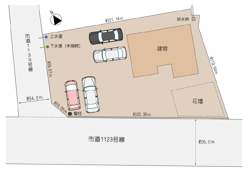 | 接道 | 南 6m(幅員) 市道 22.35m(接面) 西 4.2m(幅員) 市道 12.62m(接面) |