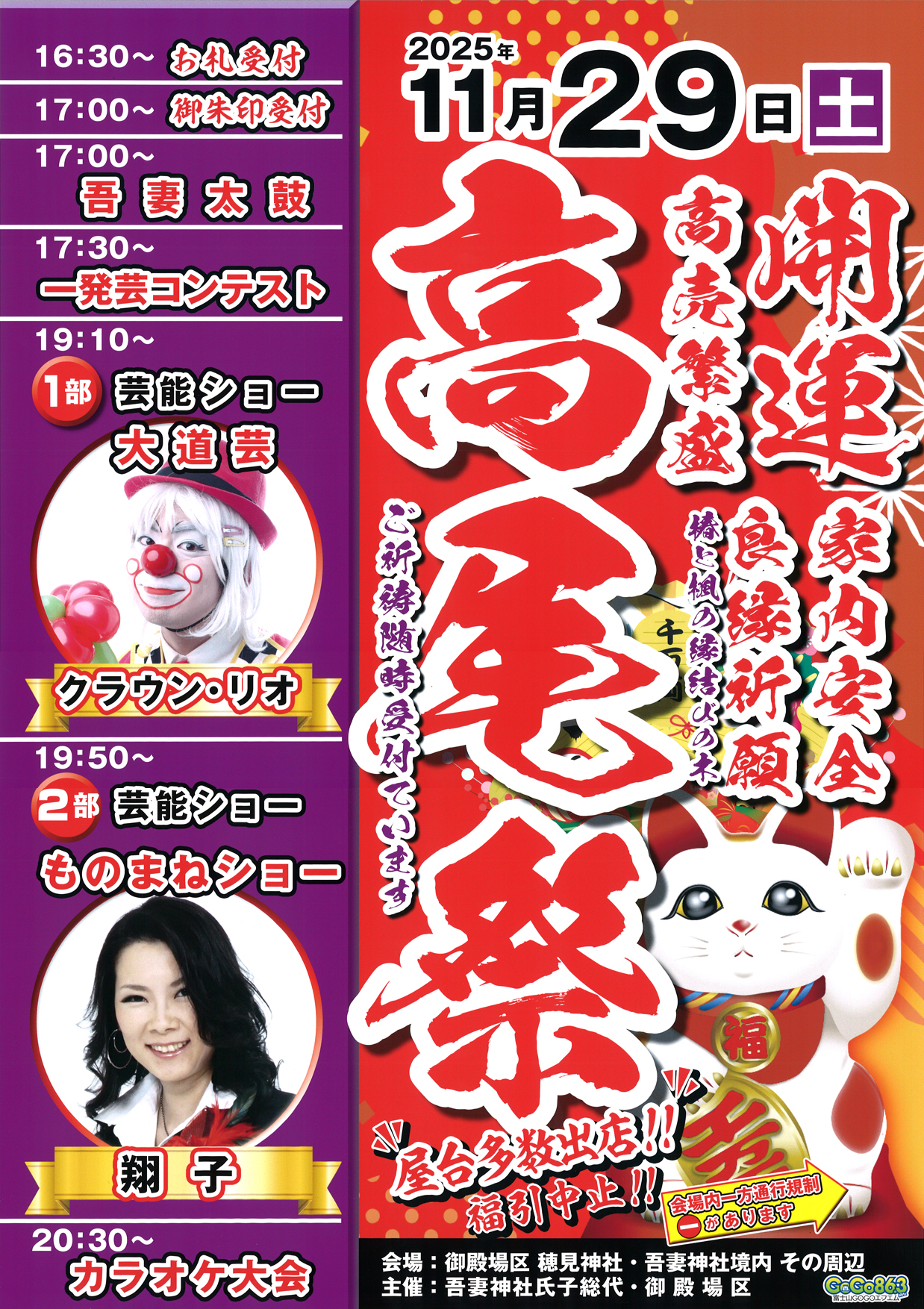 2025/10/28 二代目物語 令和7年(2025年) 高尾祭 駐車場情報 令和7年の高尾祭のお知らせです!今年も「屋台〇」「福引✕」、時間も22時頃まで今年はポ ... タグ: お祭り | 御殿場 | 高尾祭